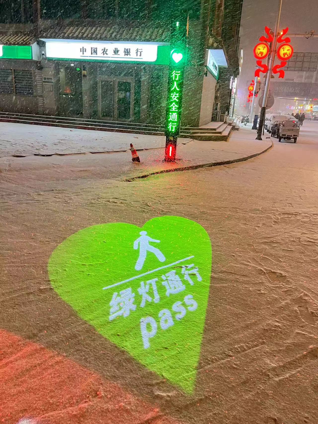 在愛心信號燈綠燈工作時,設備投射28條紅色激光線到過街行人小腿處,形成紅色區(qū)域投影,提示機動車駕駛員遠距離得到紅色警示和發(fā)現(xiàn)行人動態(tài),并及時做出反應;同時紅色光線引起行人注意,能夠警醒“低頭族”注意過街安全,從而減少交通意外的發(fā)生